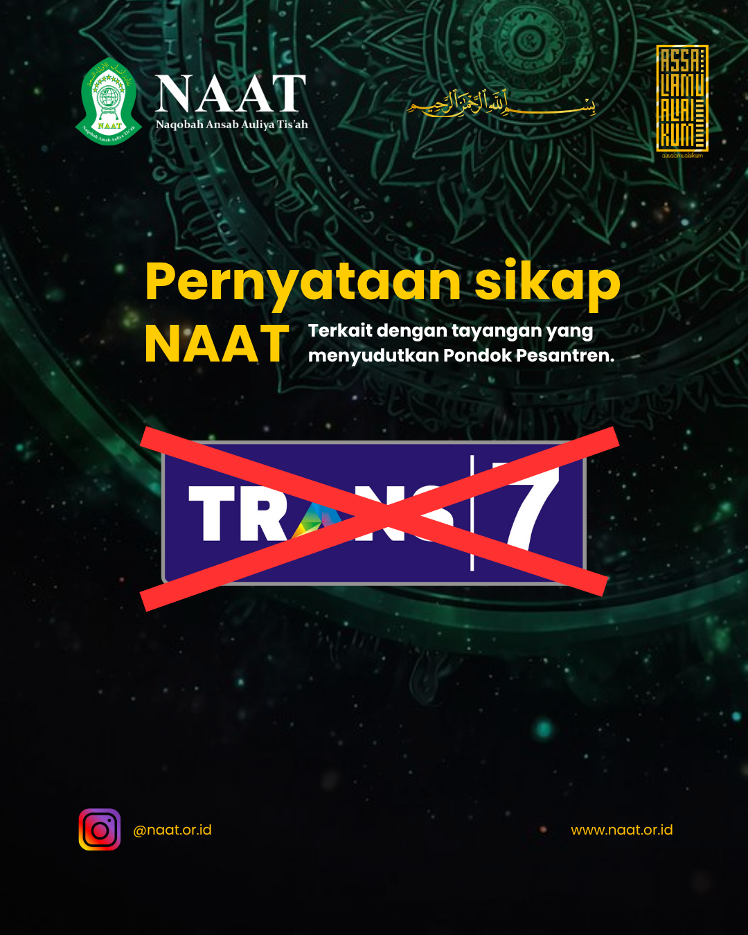 Menyusul maraknya tagar #BoikotTrans7 yang bergulir di berbagai platform media sosial, Naqobah Ansab Auliya Tis'ah (NAAT) menyatakan dukungannya terhadap gerakan penolakan atas tayangan program XPOSE yang dianggap melecehkan kehidupan pondok